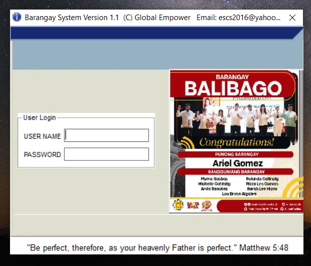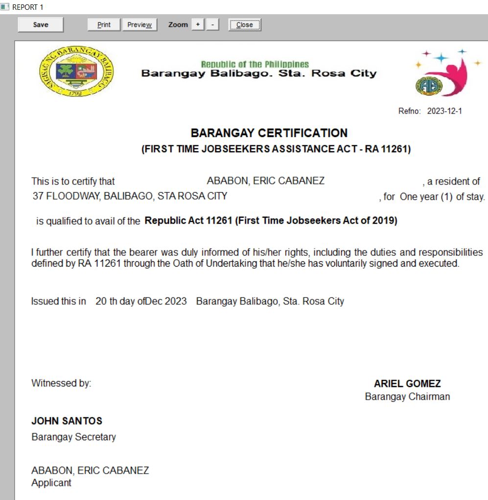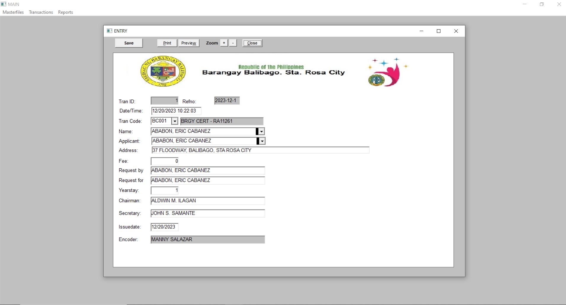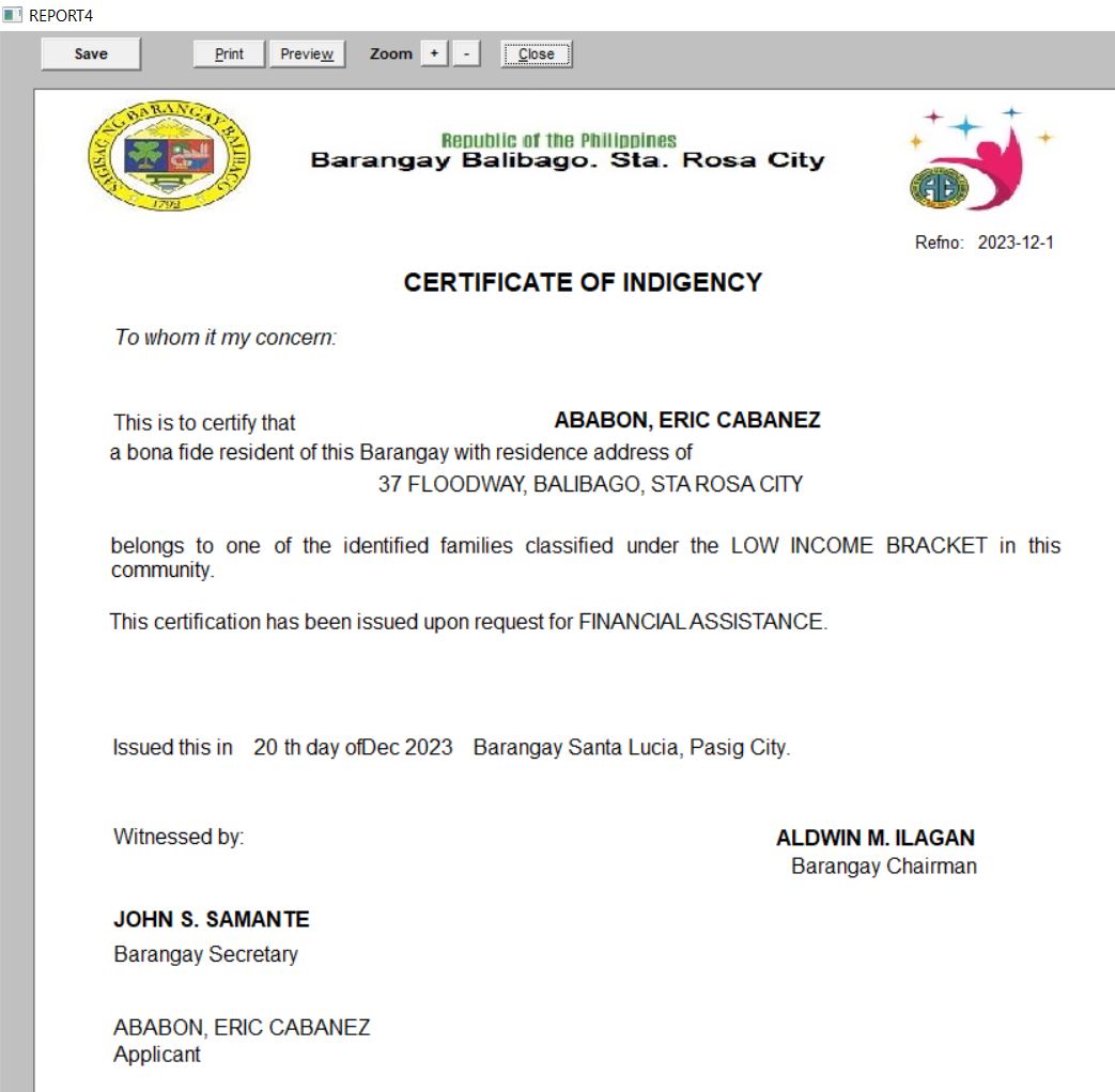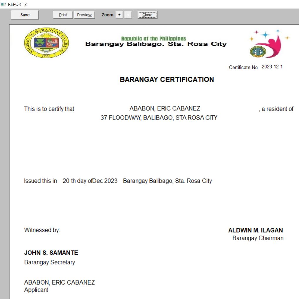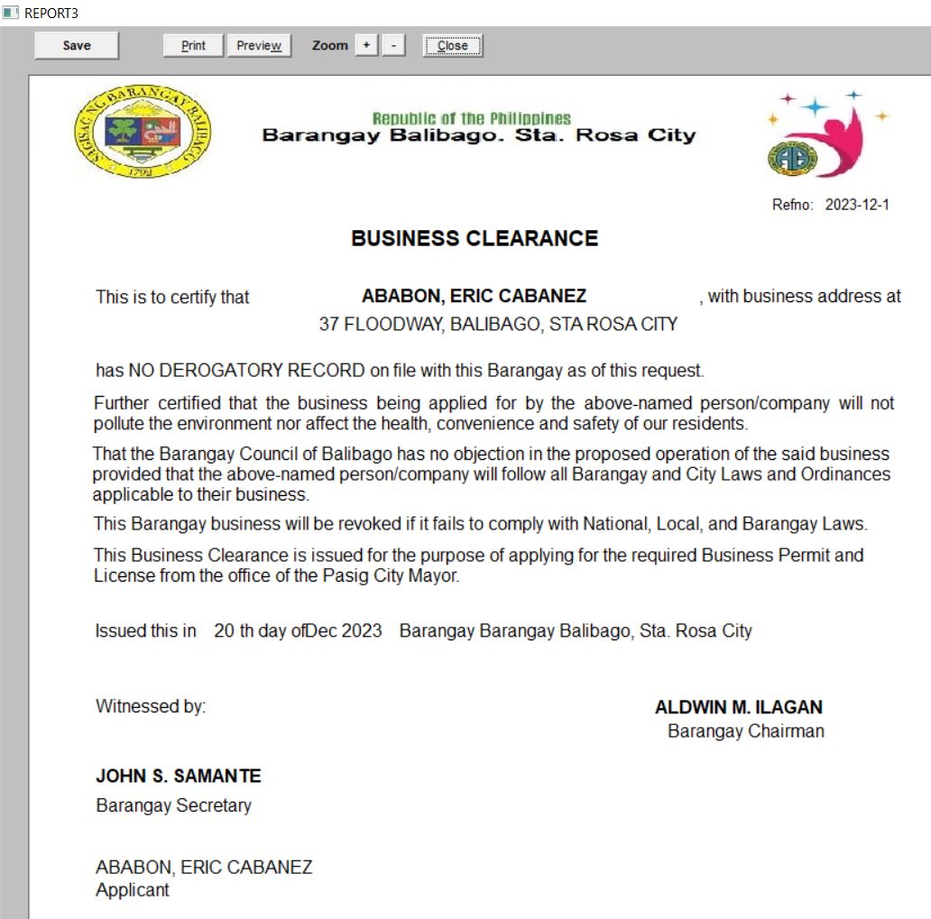 Project sponsored by Congressman . Business Permit & License of the Barangay System The Business Permit and License module builds and updates the LGU's business/barangay permit and establishment master files. The printing is very fast because the name and address of the residents are already loaded from COMELEC pdf. Before the whole process took up 30 minutes to 1 hour of waiting, now it only took 5 to 15 minutes. It also builds up and maintains data on business permit-related transactions which include: new applications and renewals of business permits, and closure of business establishments.